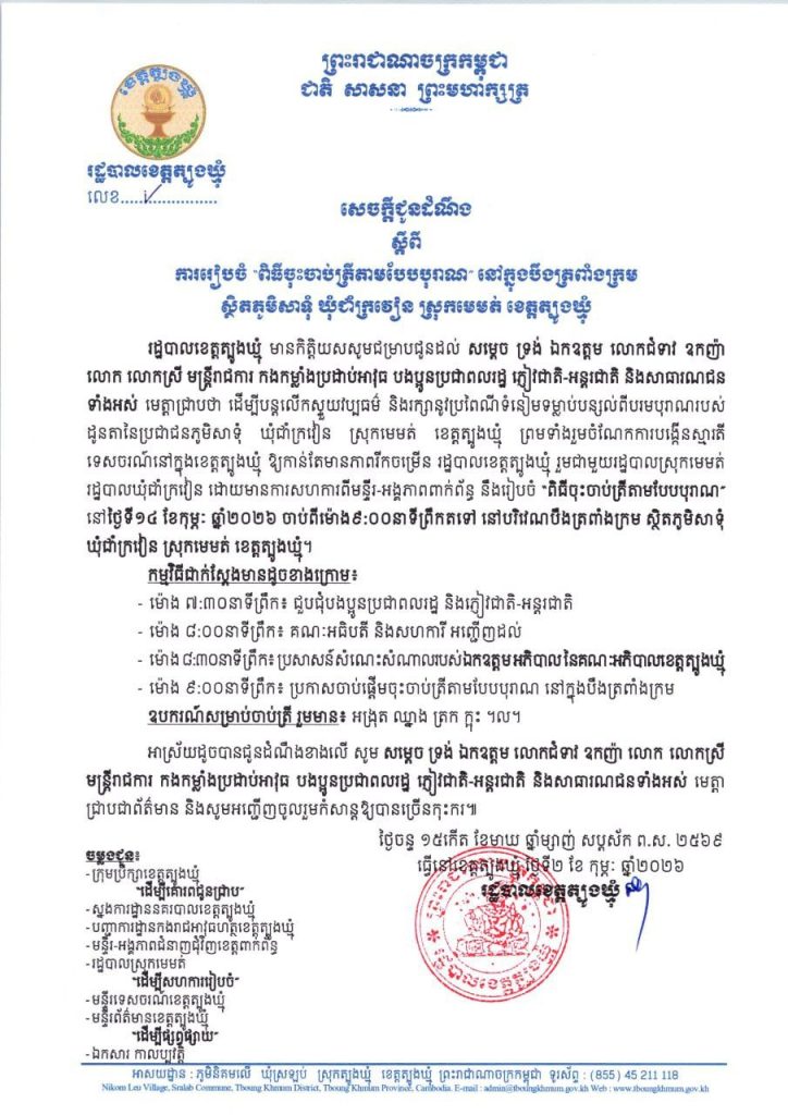 រដ្ឋបាលខេត្តត្បូងឃ្មុំ សេចក្តីជូនដំណឹង ចុះថ្ងៃទី២ ខែកុម្ភៈ ឆ្នាំ២០២៦ ស្តីពីការរៀបចំពិធីចុះចាប់ត្រីតាមបែបបុរាណ នៅក្នុងបឹងត្រពាំងក្រម នៅភូមសាទុំ ឃុំជាំក្រវៀន ស្រុកមេមត់ ខេត្តត្បូងឃ្មុំ។